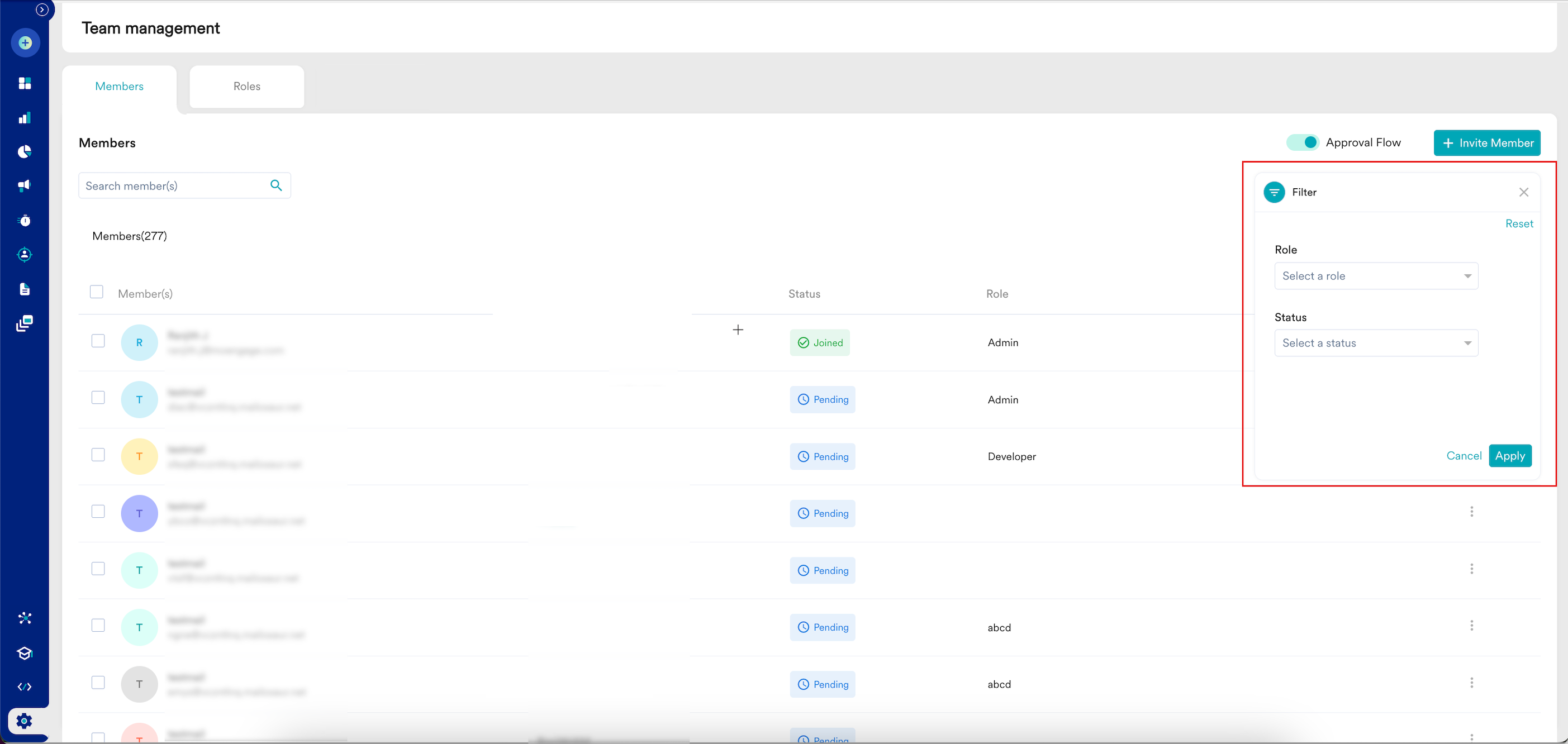 フィールド 説明 役割 メンバーの役割を選択します。 ステータス 参加済みまたは保留中など、メンバーのステータスを選択します。 - クリックして 適用 します。
