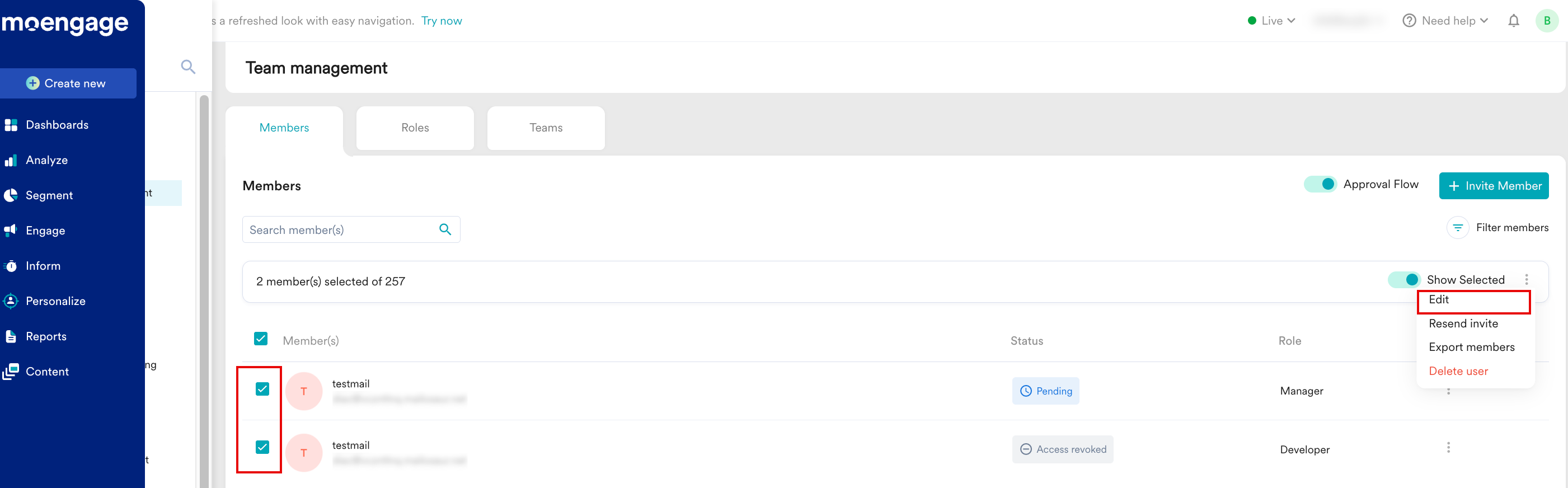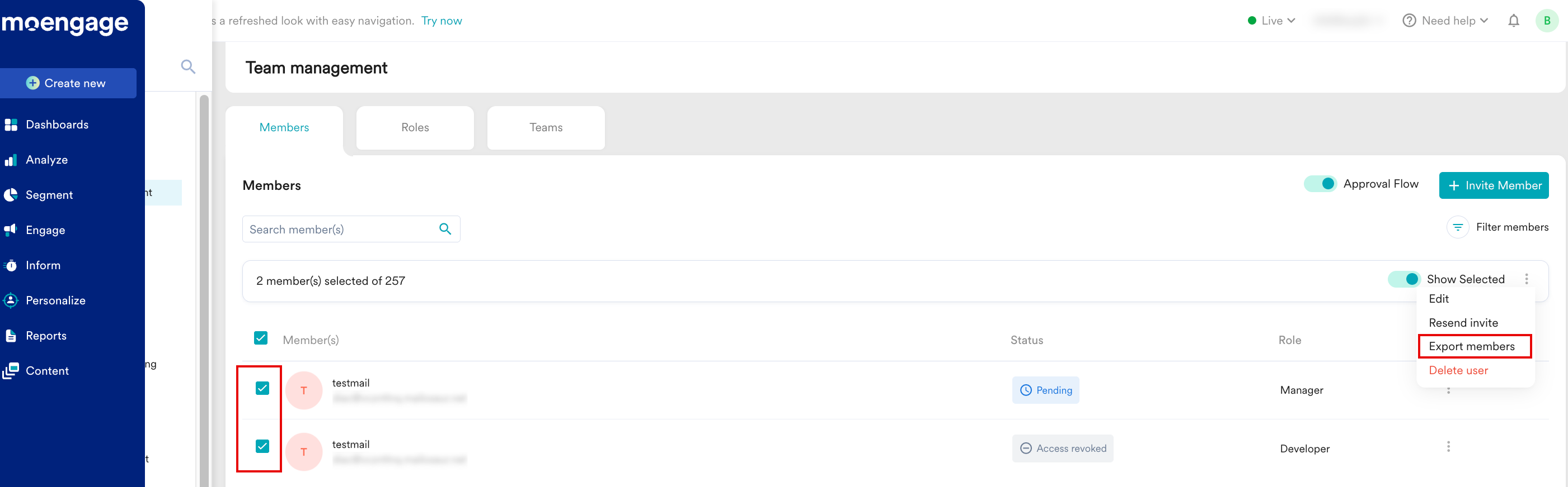 - MoEngageダッシュボードの左側のナビゲーションメニューで、 設定 > アカウント > チーム管理 > メンバー をクリックします。