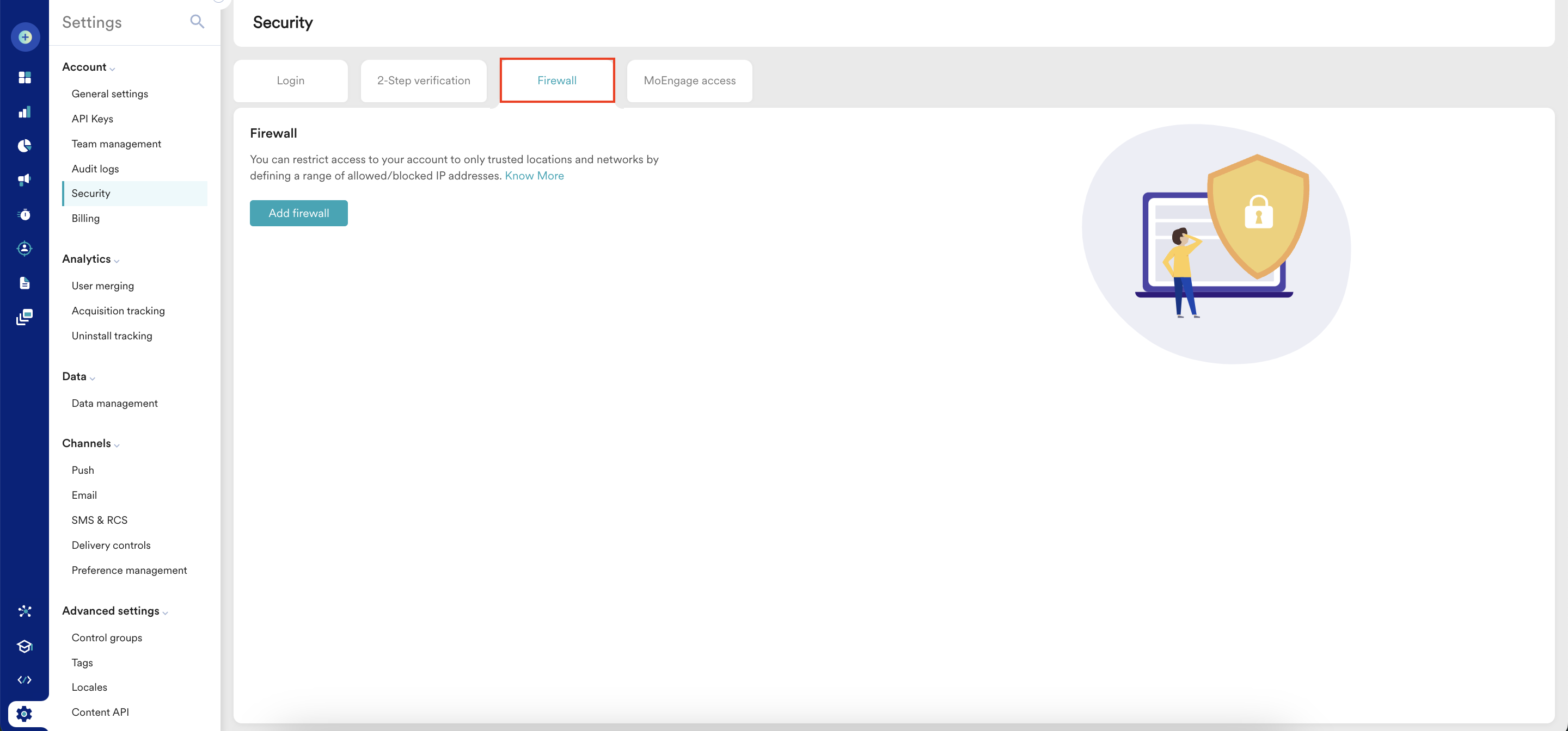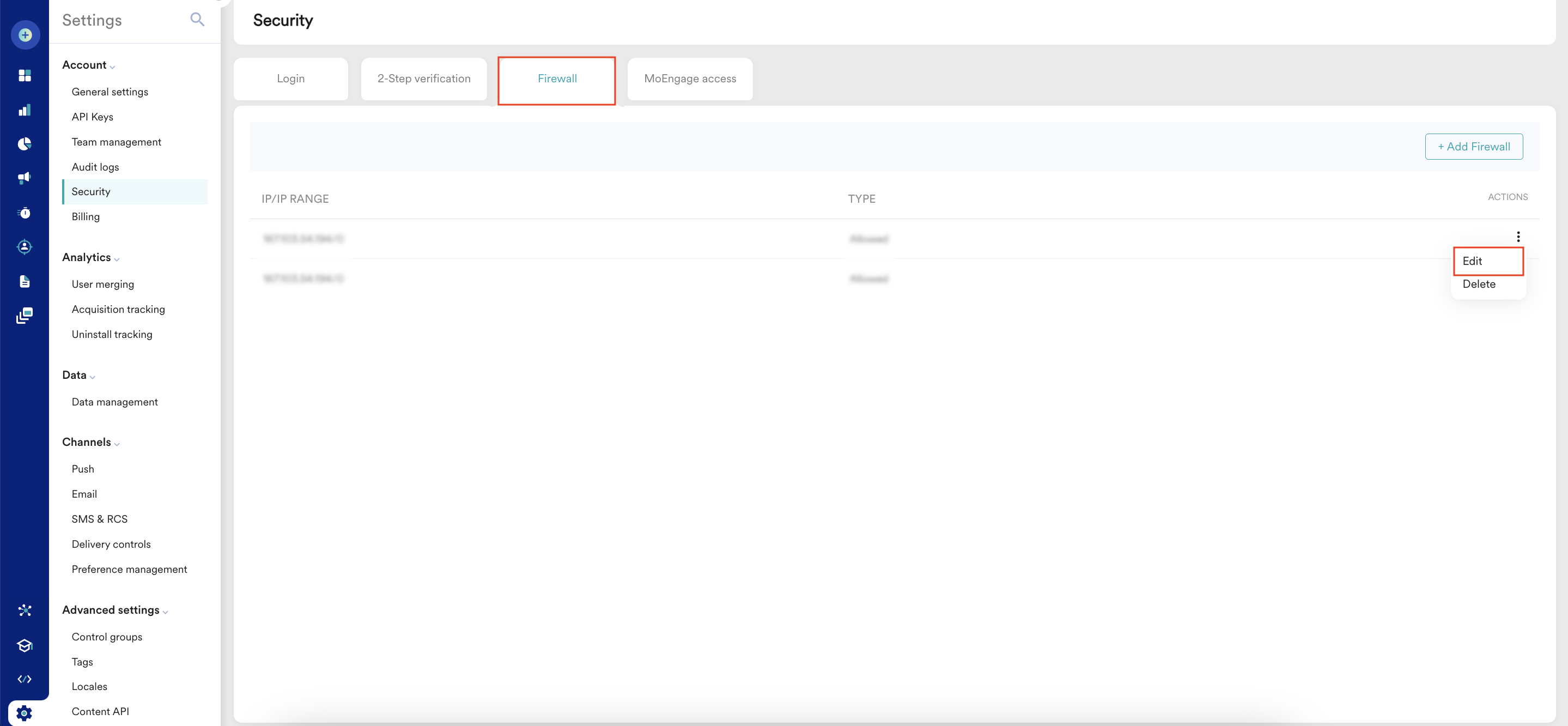 情報 MoEngage ワークスペースにファイアウォールを追加するには、管理者である必要があります。詳細については、 アクセスロール を参照してください。 |