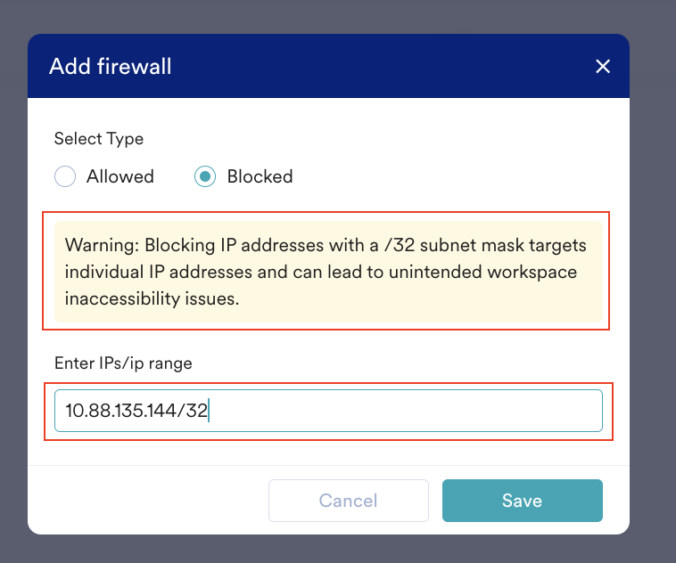 /32のサブネットマスクを持つIPアドレスをブロックすると、個々のIPアドレスに対して意図しないワークスペースのアクセス不可の問題が発生する可能性があります。