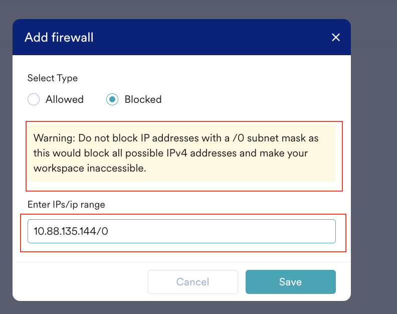 /0のサブネットマスクを持つIPアドレスをブロックすると、すべてのIPv4アドレスがブロックされ、ワークスペースにアクセスできなくなります。