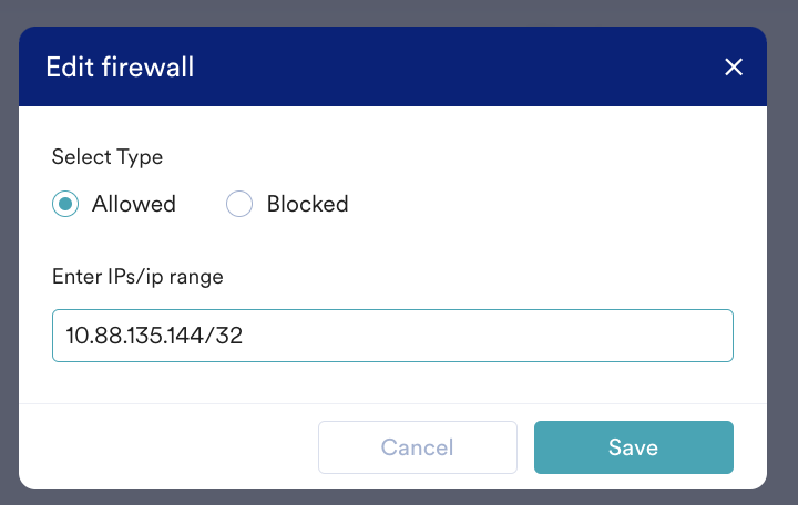 - 許可された :このオプションを選択すると、任意のIPをホワイトリストに追加できます。特定のIPアドレスまたは範囲を追加し、MoEngageダッシュボードへのアクセスを許可します。これらのIPから発信される接続のみが成功します。これは、オフィスや指定されたVPNなどの認可されたユーザーとネットワークへのアクセスを制限するためのセキュリティ対策です。