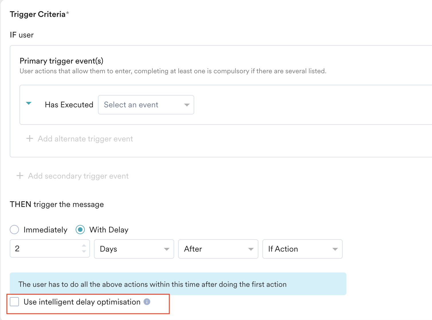 インテリジェント遅延最適化を使用 のチェックボックスを選択して、ユーザーイベント条件が満たされた後にキャンペーンの配信をリアルタイムで最適化します。このオプションは、プッシュキャンペーンにのみ利用できます。詳細については、 トリガー遅延最適化 を参照してください。