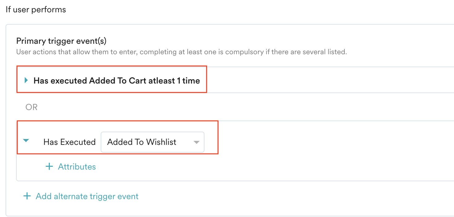 複数の主要条件を使用して、イベントトリガーキャンペーンを設定できます。ユーザーは、トリガーイベントのいずれかを完了した後にキャンペーンを受け取ります。「 プライマリートリガーイベント 」セクションでは、「+ 代替トリガーイベントを追加」をクリックすることで、「OR」演算子を使用して複数のイベントを追加できます。たとえば、ユーザーが カートに追加 イベントまたは ウィッシュリストに追加 イベントを実行した場合にメッセージを送信するには、以下のように条件を設定できます: