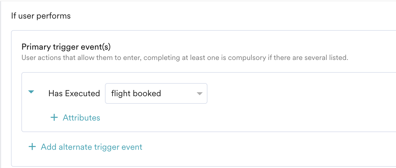 イベントトリガーを使用すると、 If イベントのイベント属性の特定の値に基づいてメッセージを送信できます。たとえば、フライトの時間の2時間前にユーザーに予約されたフライトをリマインドするには、 フライト予約済み イベントで flight_time イベントプロパティを使用してトリガーを作成します。その後、フライト時間の2時間前に通知を送信するように設定します。