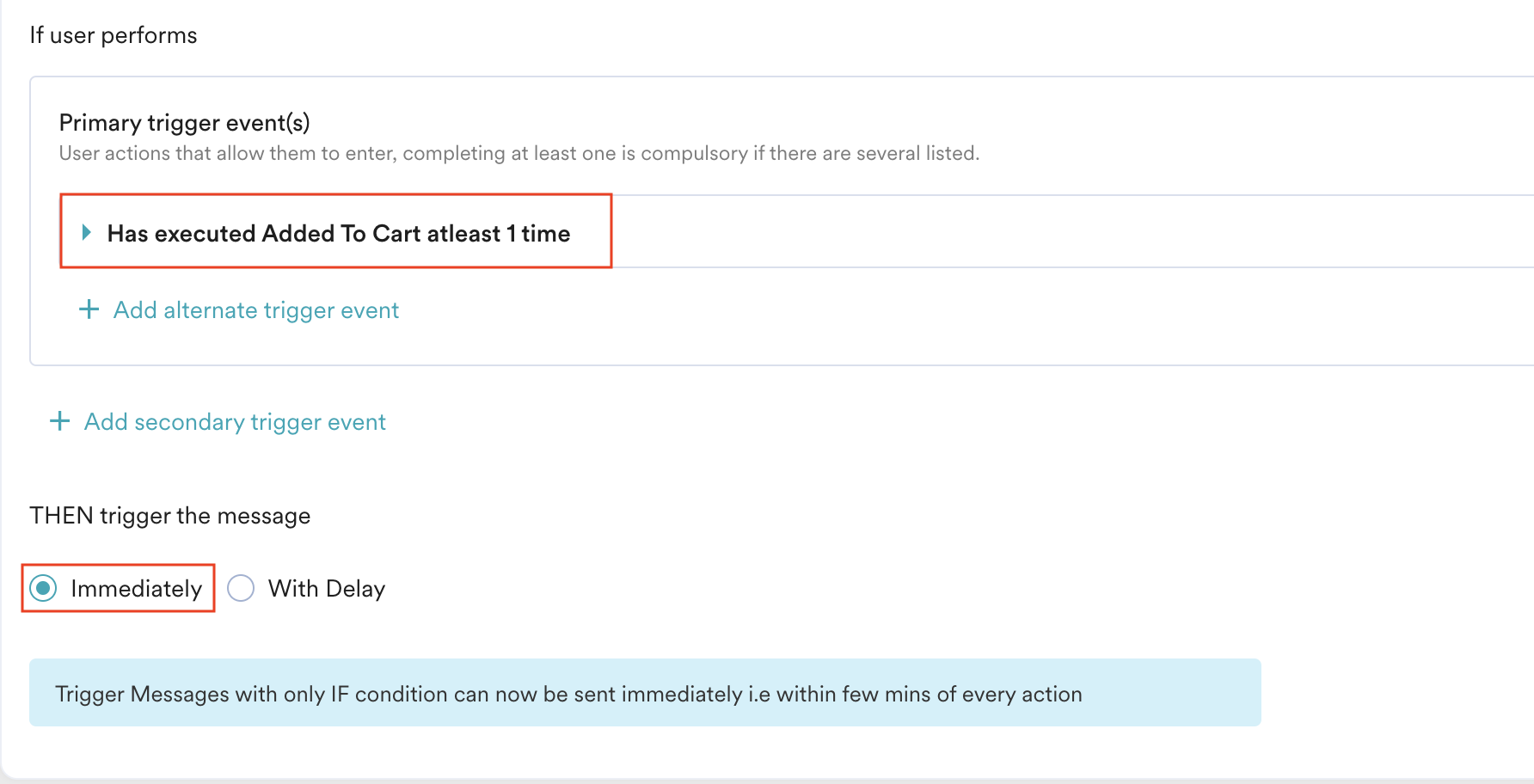 時間に敏感なメッセージを送信できます。「if」条件のみでキャンペーンを即座に送信できます。これらのキャンペーンは、定義されたトリガーアクションの数分以内に単一のトリガーイベントに基づいてメッセージを送信できます。