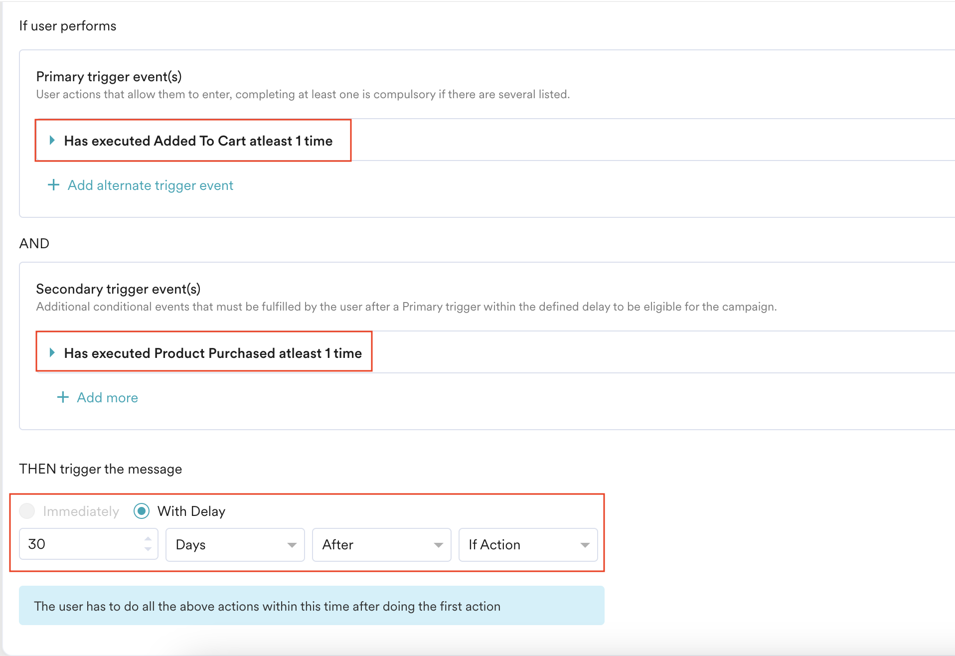 複数の条件を持つイベントトリガーキャンペーンを設定できます。プライマリの「If」条件とセカンダリの「AND」条件を定義できます。たとえば、ユーザーが商品をカートに追加したが、特定の期間内に購入しなかった場合にメッセージを送信できます。イベントをトリガーする例条件は次のようになります: