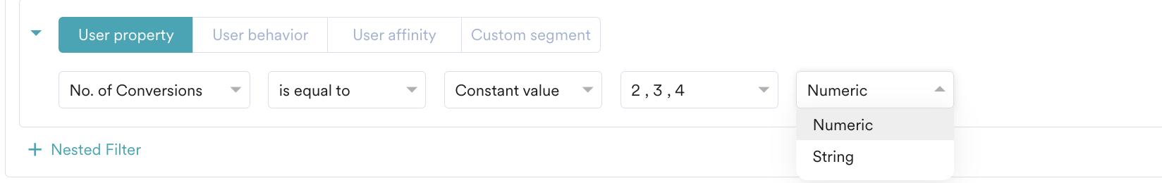 Note イベントおよびユーザー属性に許可されているデータ型をマークします。これにより、セグメンテーションと分析に適切なオペレーターが利用可能になります。 属性の許可されるデータ型を定義した後、MoEngage は受信データを設定されたデータ型に型変換しようとします。データ管理ページでデータ型を定義できます。 |