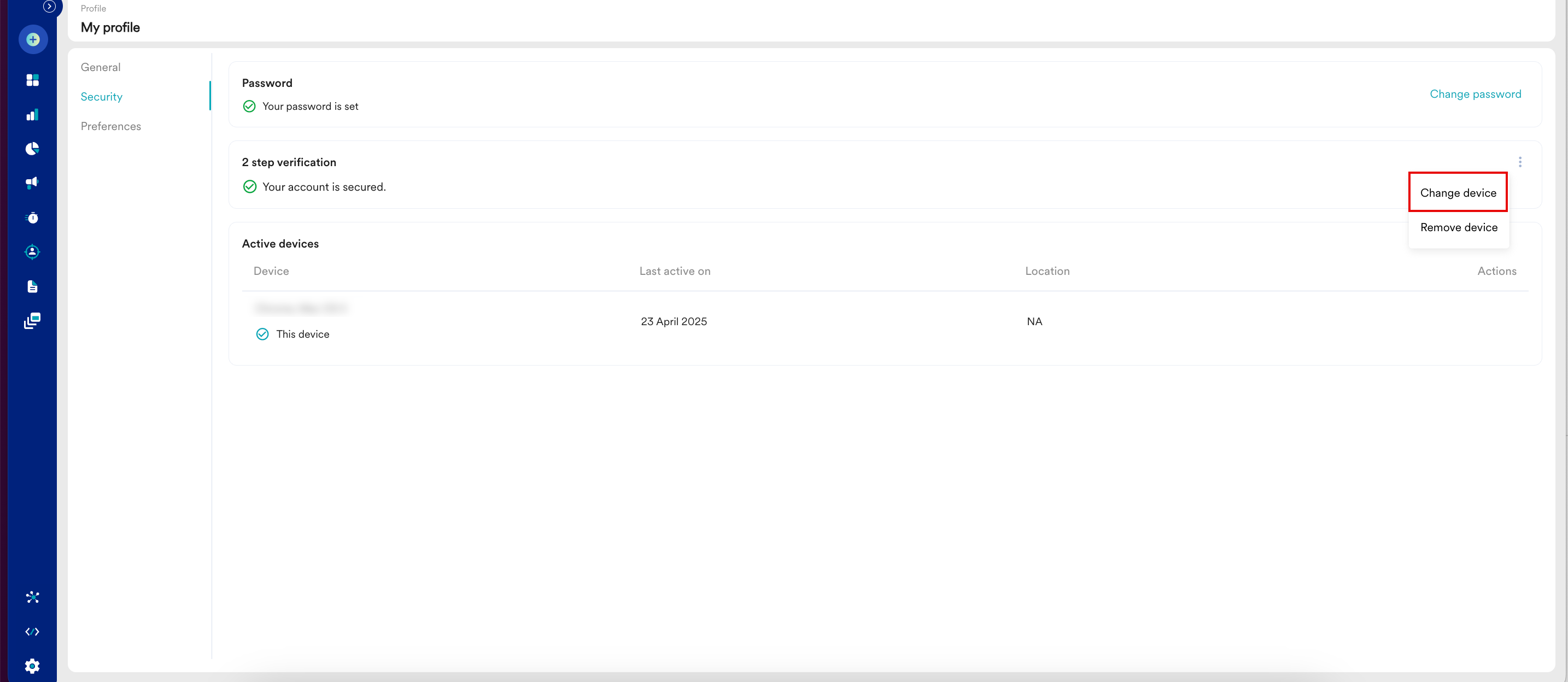 Information デバイスの変更 オプションは、ワークスペースの2FAを有効または無効にしたときに表示されます。 |