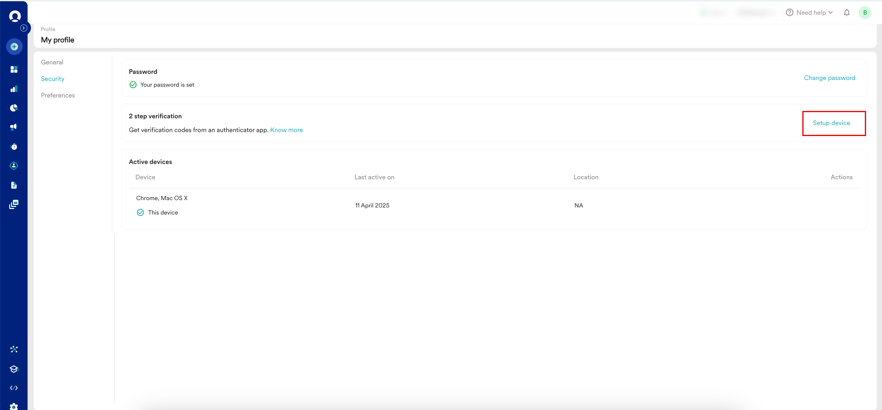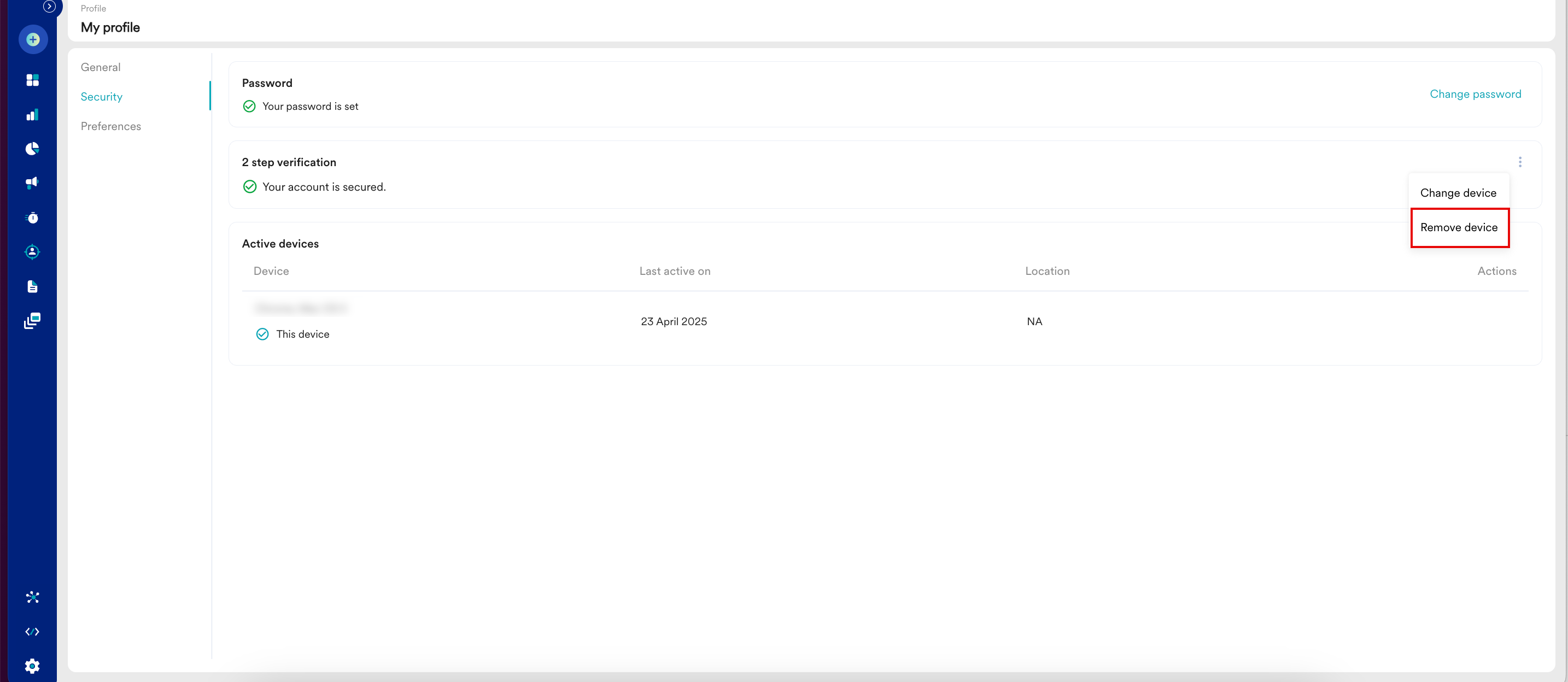 アクティブデバイス の下に、このワークスペースにアクセスするために使用したすべてのデバイスが表示されます。デバイスからログアウトするには、次の手順を実行します: