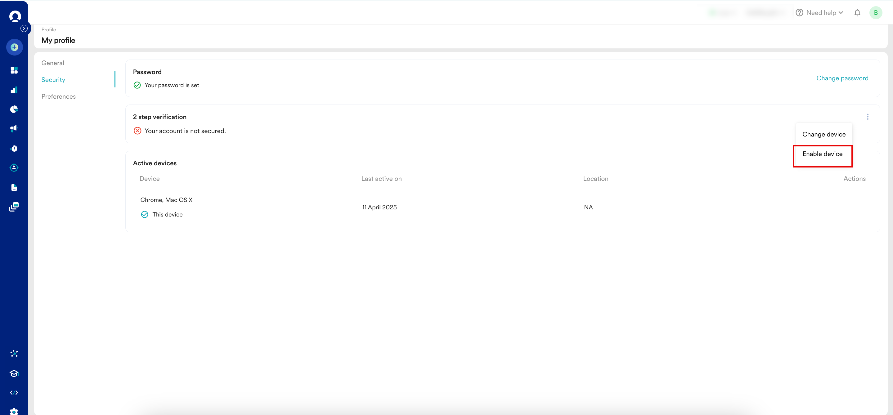 Information デバイスを有効にする オプションは、管理者がアカウント(ワークスペース)レベルで2FAを無効にし、あなたがワークスペースでそれを有効にしていない場合にのみ表示されます。 |