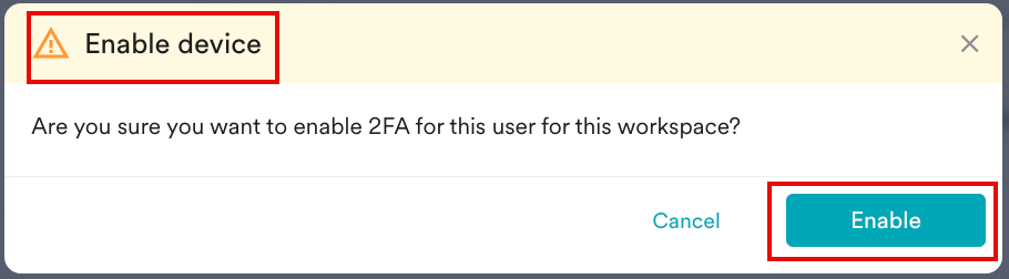 デバイスを有効にするポップアップウィンドウが表示され、ワークスペースの2FAを有効にするための確認を求められます。 -