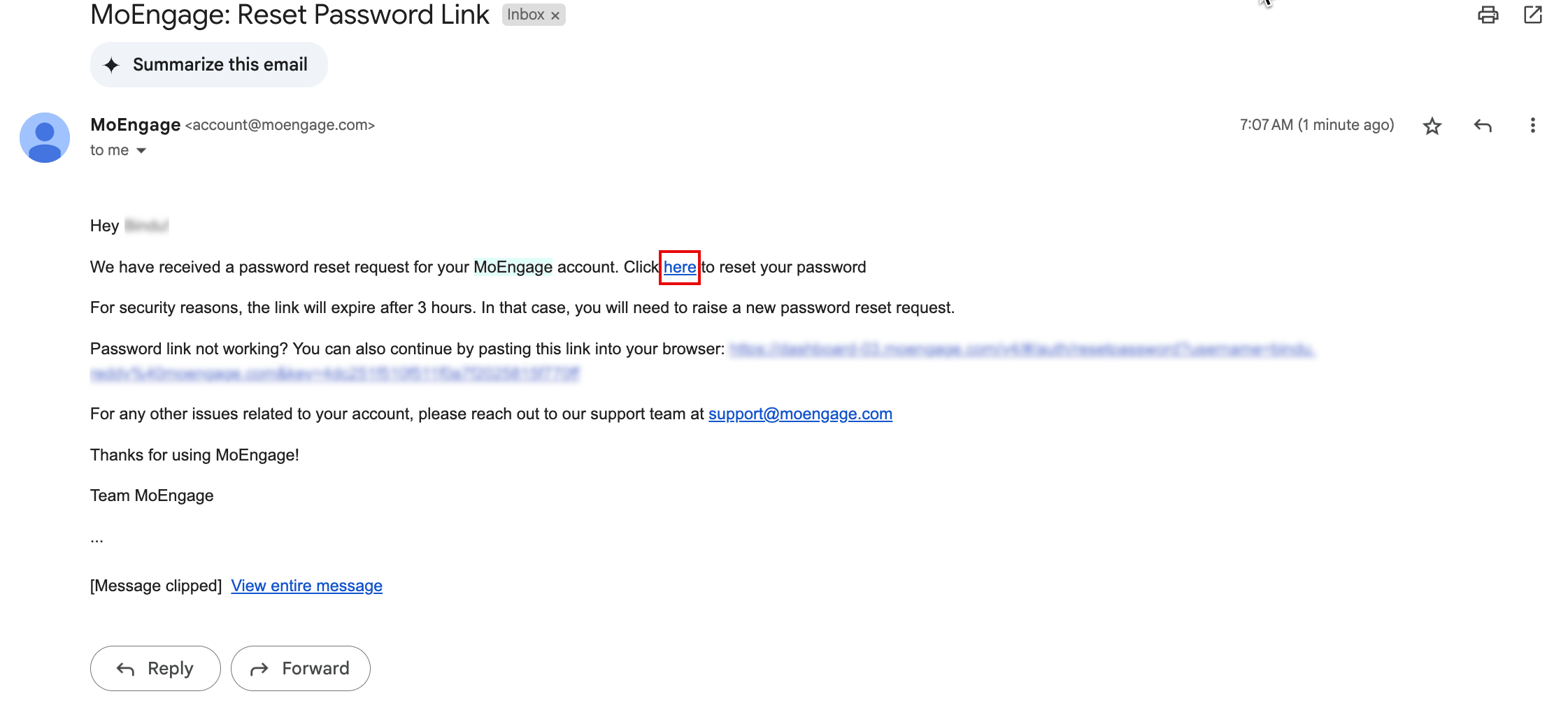 MoEngageからパスワードをリセットするためのリンクが含まれたメールが届きます。 - MoEngageから受け取ったメールを開き、パスワードをリセットするためのリンクをクリックしてください。