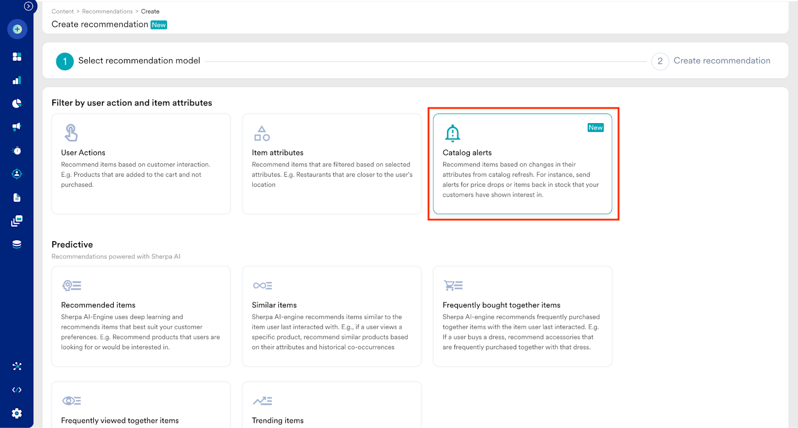 - MoEngageダッシュボードの左側のナビゲーションメニューで、 コンテンツ をクリックし、次に 推奨 をクリックします。詳細については、 ユーザーアクション推奨の作成 を参照してください。