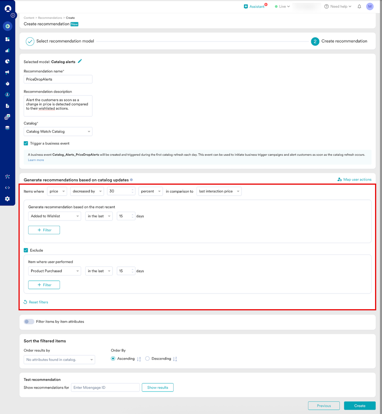 セクションで、MoEngage由来の属性または他の数値カタログ属性によって推奨結果を並べ替えます(例: