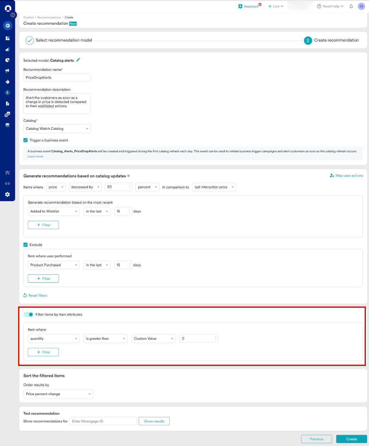- フィルター条件を追加し、ユーザーに推奨するアイテムを制御するために、 アイテム属性でアイテムをフィルター するトグルをオンにします。これらのフィルターは カタログアラート モデルの推奨に適用されます(例:数量が0より大きい)。