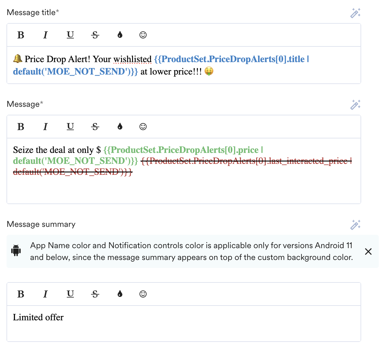 たとえば、カタログ{{price}}の横に配置された{{last_interaction_price}}は、検出された価格の実際の差を示しており、キャンペーンをクリックする自信を高めます。