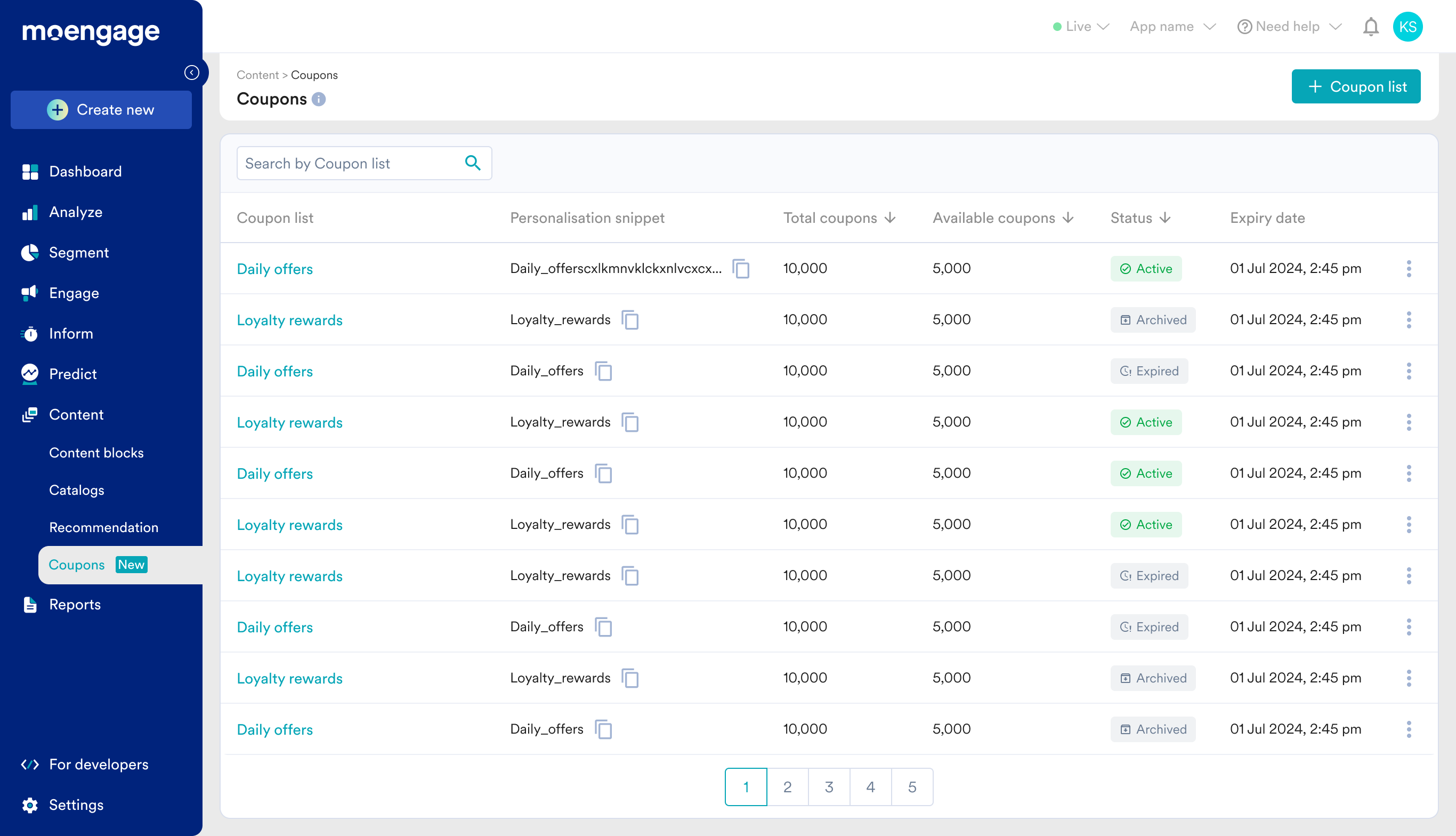 - クーポンリスト : これは、システム内に保存されているすべてのクーポンの一種のリポジトリです。各クーポンの単回使用クーポンコードのみが含まれています。これらのリストは、すべてのクーポン関連の操作の基盤として機能します。MoEngageでは、複数のクーポンリストを作成できるため、異なる種類のコードやさまざまなキャンペーンのために異なるリストを維持できます。