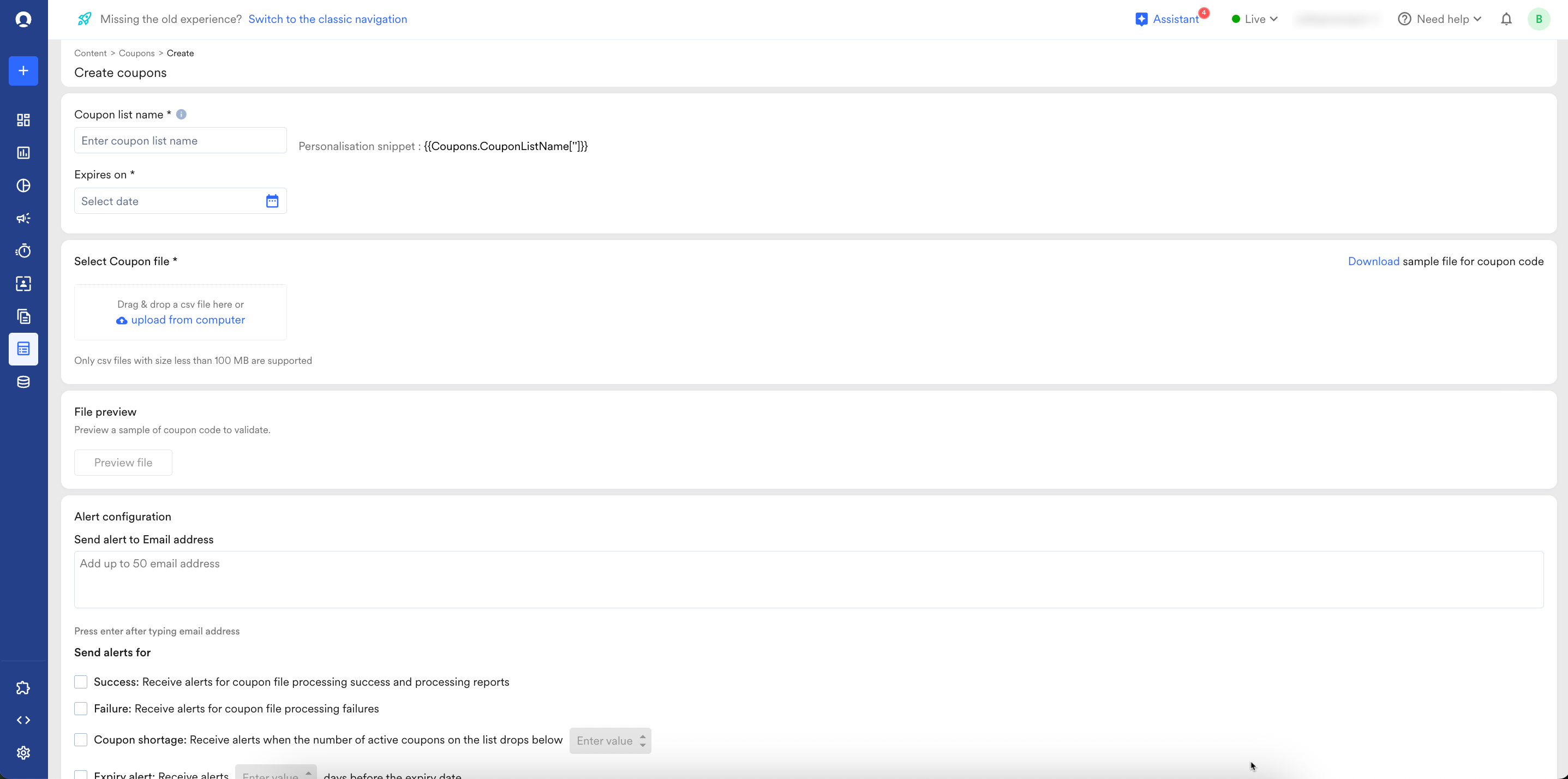 MoEngageはプロモーションコードの配布と管理を効率化することに重点を置いていますが、あなたの側で引き換えの検証を生成し、実装することを期待しています。サードパーティツールまたは内部システムからクーポンコードを作成し、それらをCSVファイルにまとめることができます。このクーポンファイルをMoEngage Couponsプラットフォームにインポートして、これらのクーポンベースのキャンペーンを送信できます。