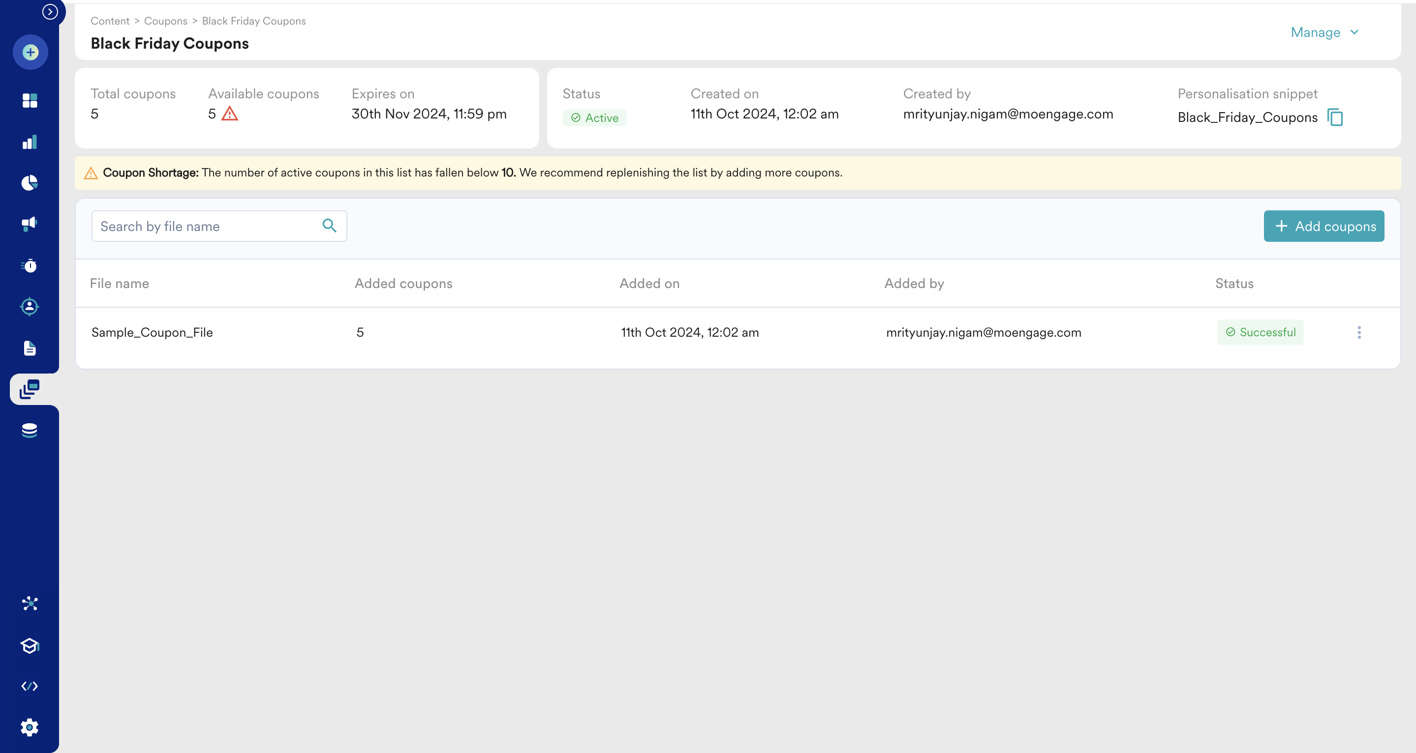 クーポンベースのキャンペーンを続けるために、より多くのクーポンを作成する際には、クーポン生成システムからクーポンのCSVファイルを生成し、それをアップロードしてMoEngageのクーポンリストを補充する必要があります。