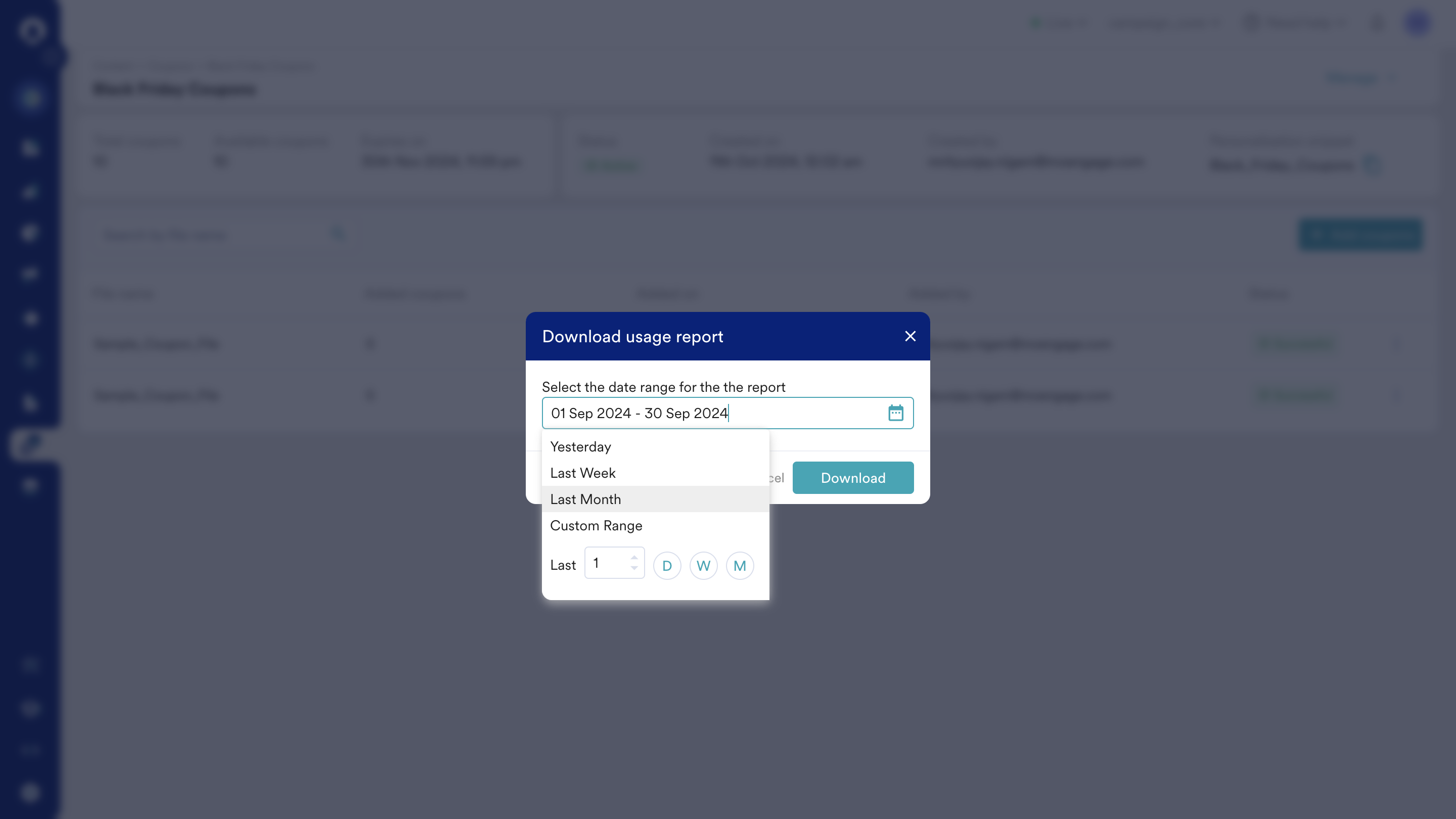 ダウンロード使用レポートダイアログボックスで、クーポン配布レポートをエクスポートしたい希望の日付範囲を選択してください。