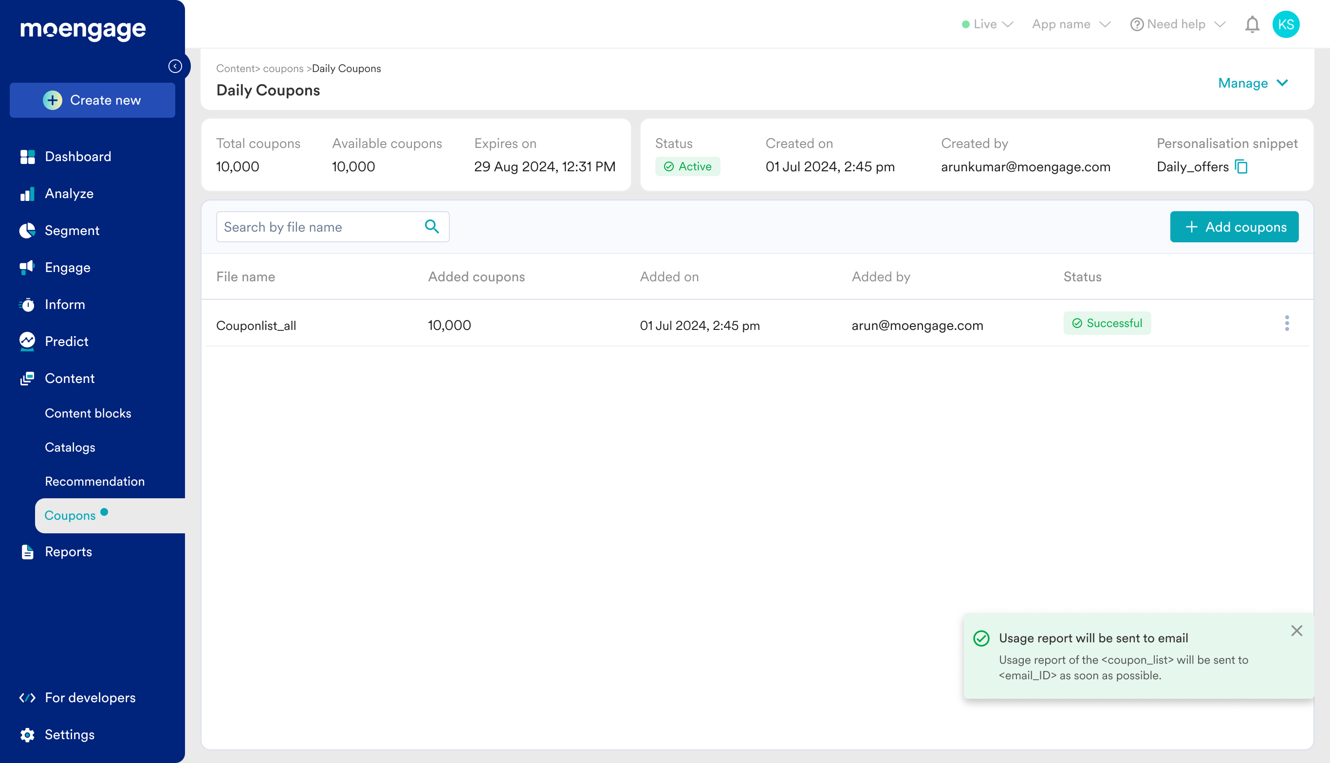 MoEngageはクーポンコードの引き換えを確認しません。異なるキャンペーンで使用されたクーポンリストの監査報告書を生成できます。詳細については、 サンプル使用レポート を参照してください。