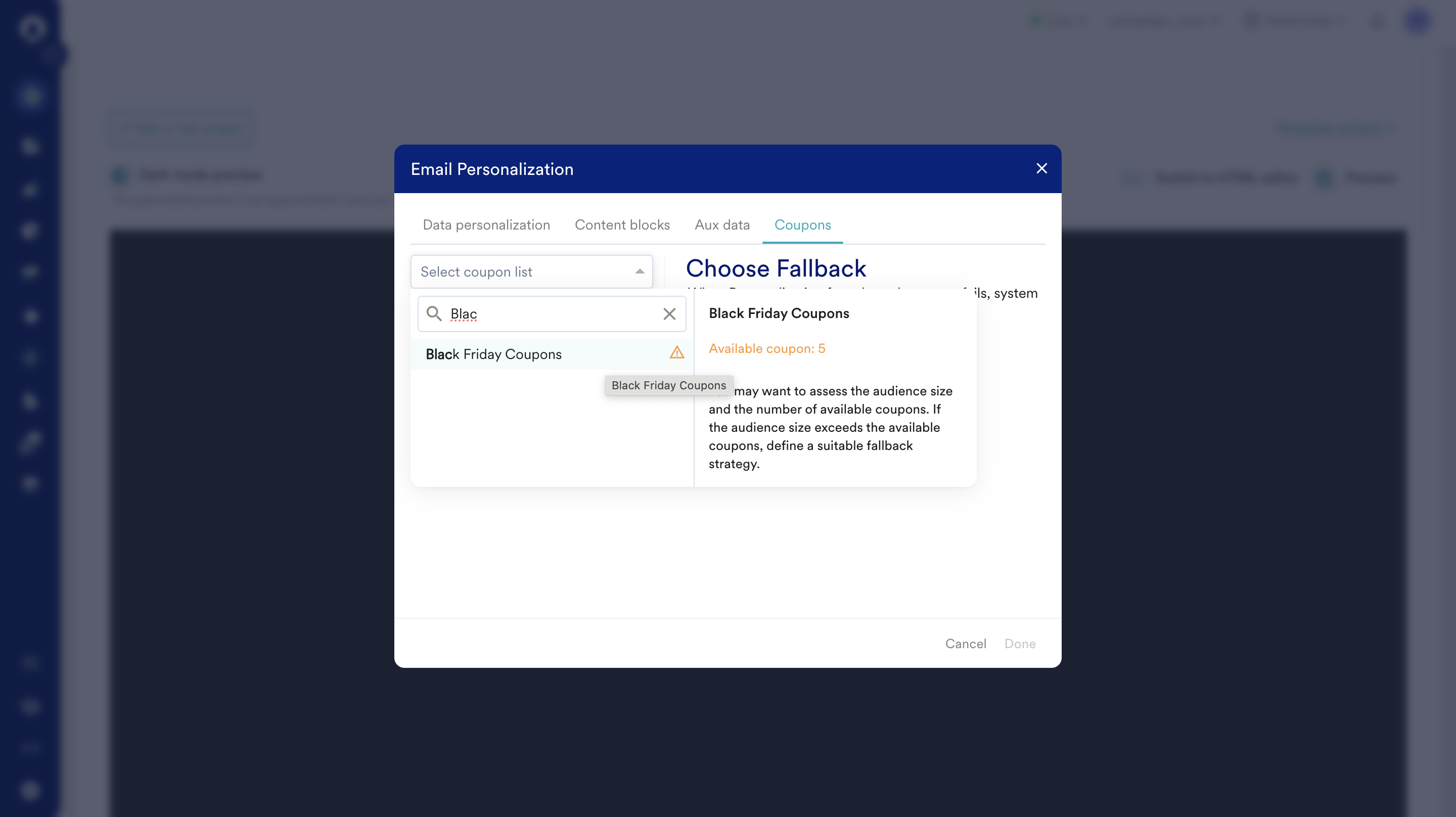 リスト内のクーポン数がクーポンリスト設定の定義された不足閾値を下回ると、警告アイコンが表示されます。これは、キャンペーンを送信する前に、オーディエンスのサイズ、クーポン数、および再補充を確認するためのプロンプトです。 - クーポンリストを選択し、クーポンリストがクーポンを取得できない場合に何が起こるかを定義するフォールバックを選択します。選択すると メールを送信しない が、クーポンコードなしでのメールの配信を停止します。代替として静的なフォールバッククーポンコードを使用することもできます。