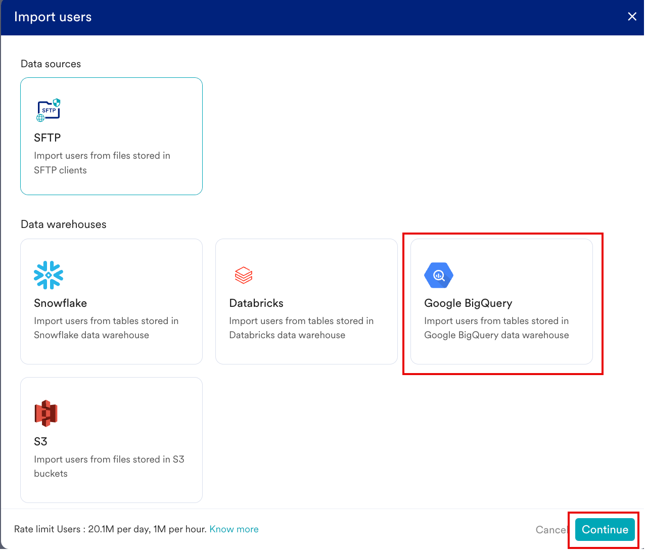 MoEngageは、あなたのBigQueryデータウェアハウスからの次のタイプのデータインポートをサポートしています: