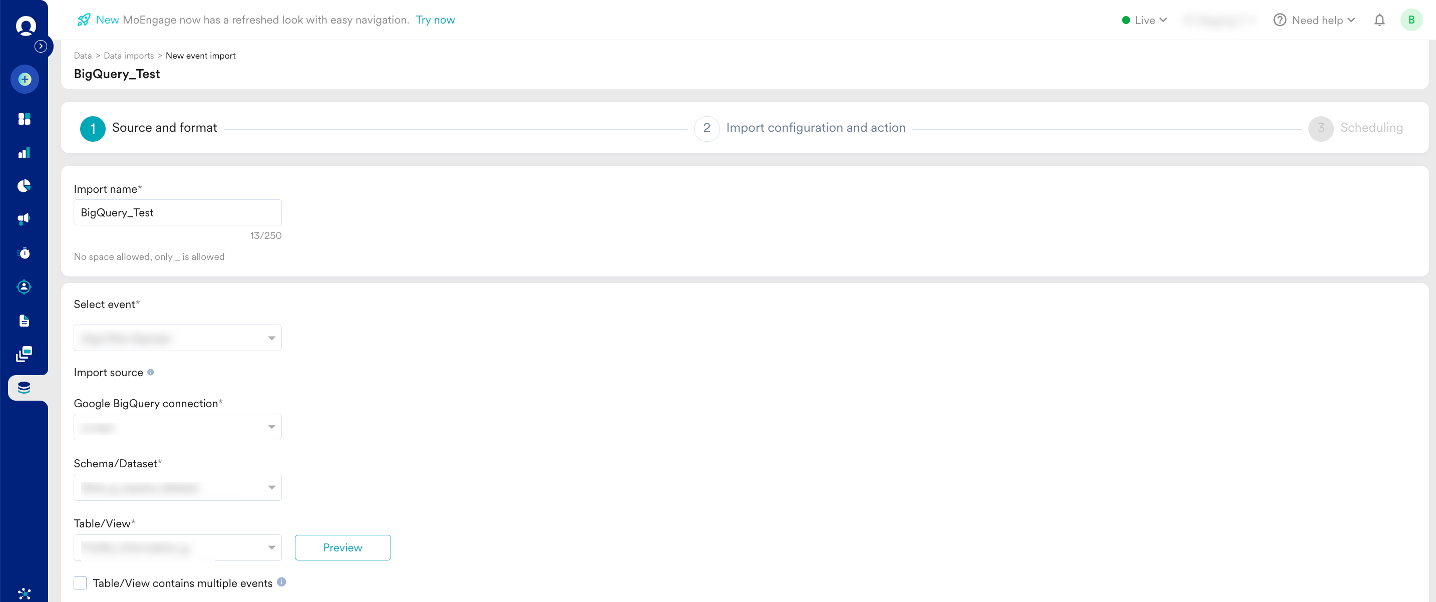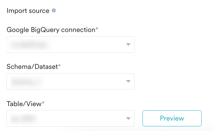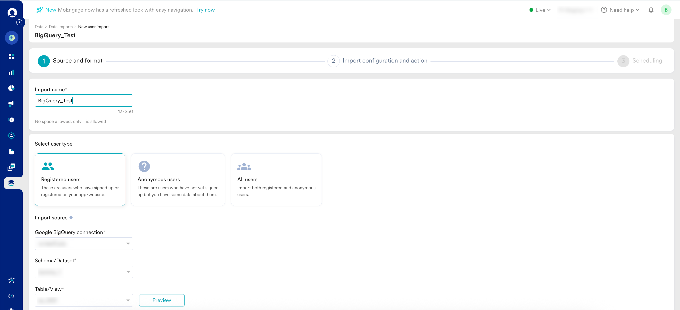 Yes.私たちは、あなたのBigQueryビューからデータをインポートすることもサポートしています。MoEngageにViewsを読み取るアクセスを許可すると、それらは自動的にテーブル/ビューの選択ドロップダウンリストに表示されます。