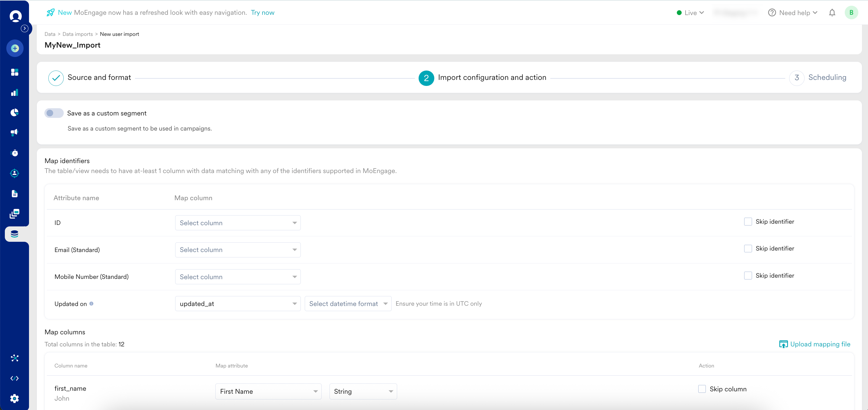 When importing users, you can include them in a custom segment in MoEngage. The imported users are consistently added to this segment with each sync, and no users will be removed. To save imported users as a custom segment, perform the following steps: