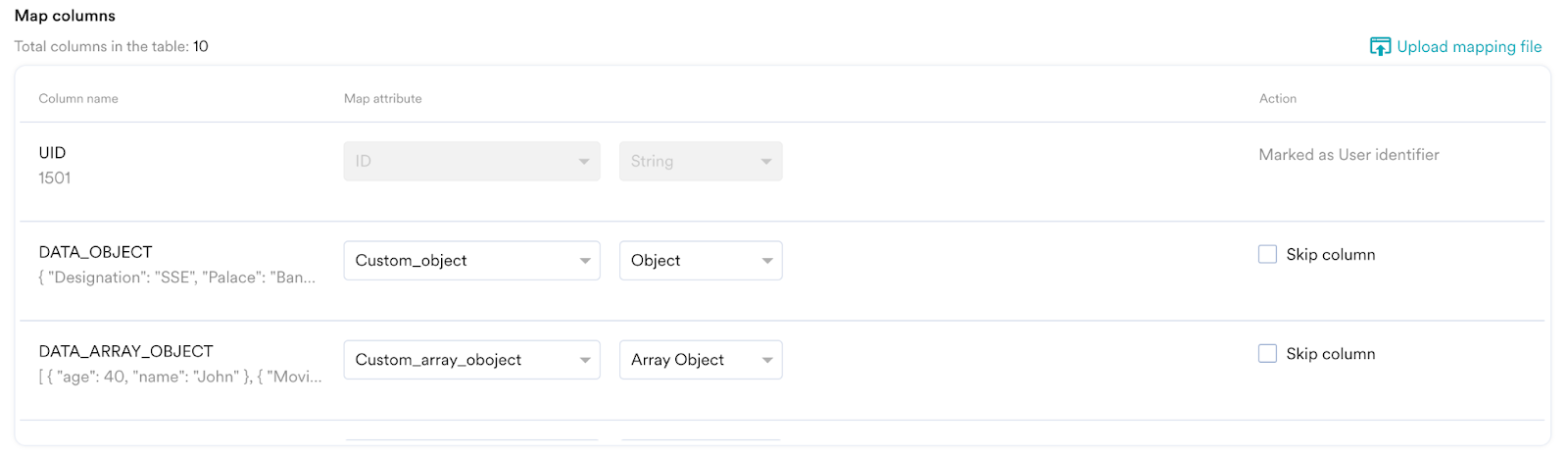 マニフェストファイルにテーブルにない追加の列がある場合、それらは無視されます。また、既存のテーブル列のマッピングがマニフェストファイルに存在しない場合、MoEngageはマッピングを空白のままにしておくので、手動で設定できます。