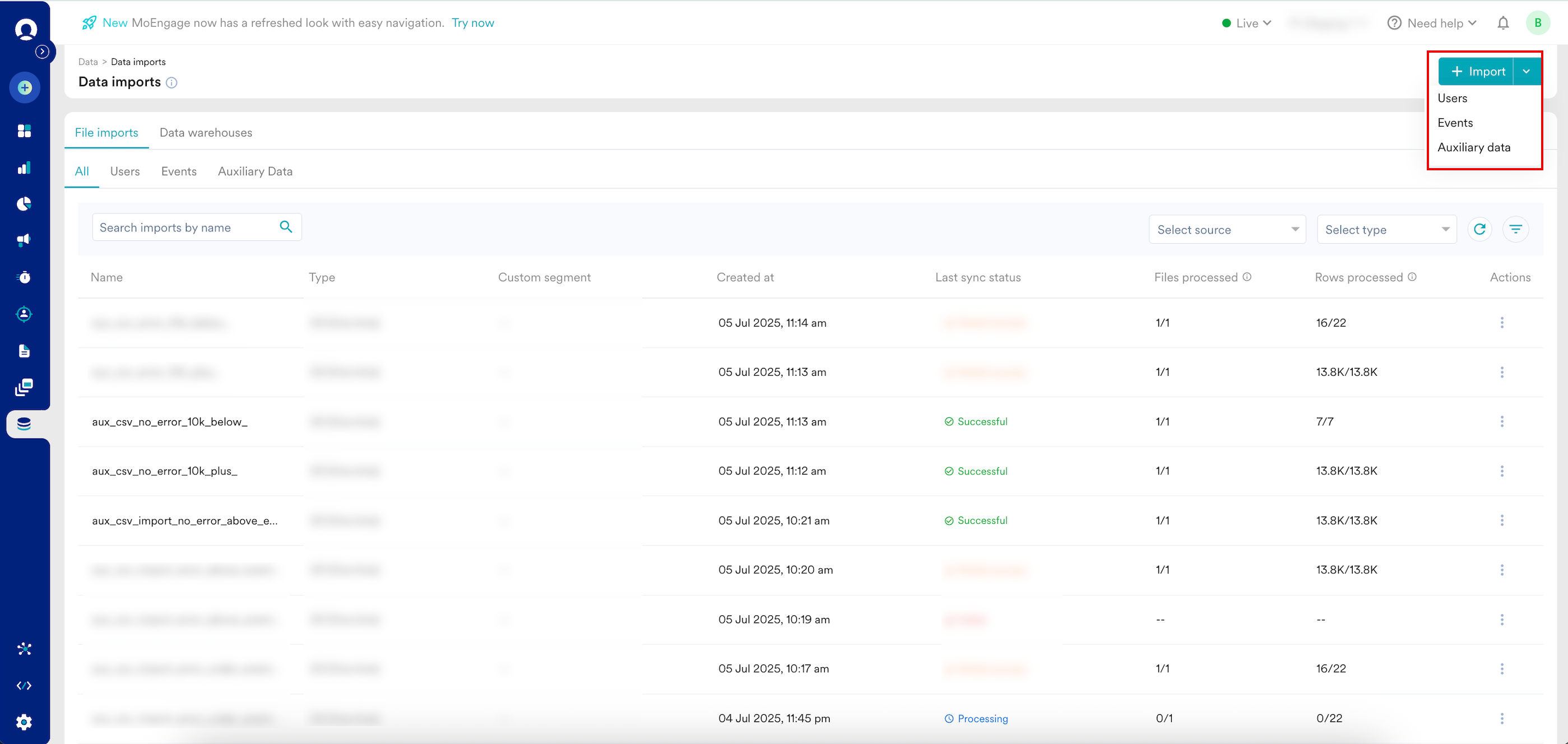 - MoEngage ダッシュボードの左側のナビゲーションメニューで、 データ > データインポート をクリックします。