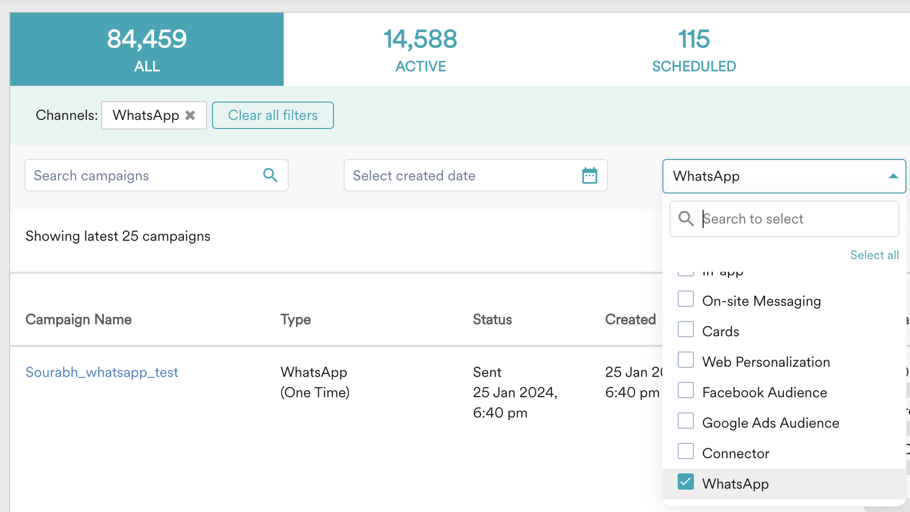 「 MoEngage ダッシュボード 」 > 「 Engage 」 > 「 すべてのキャンペーン 」ページに移動します。表示したいキャンペーンを検索するにはフィルターを使用してください。MoEngageは、作成したすべてのWhatsAppキャンペーンを表示できるチャネルフィルターも提供します。