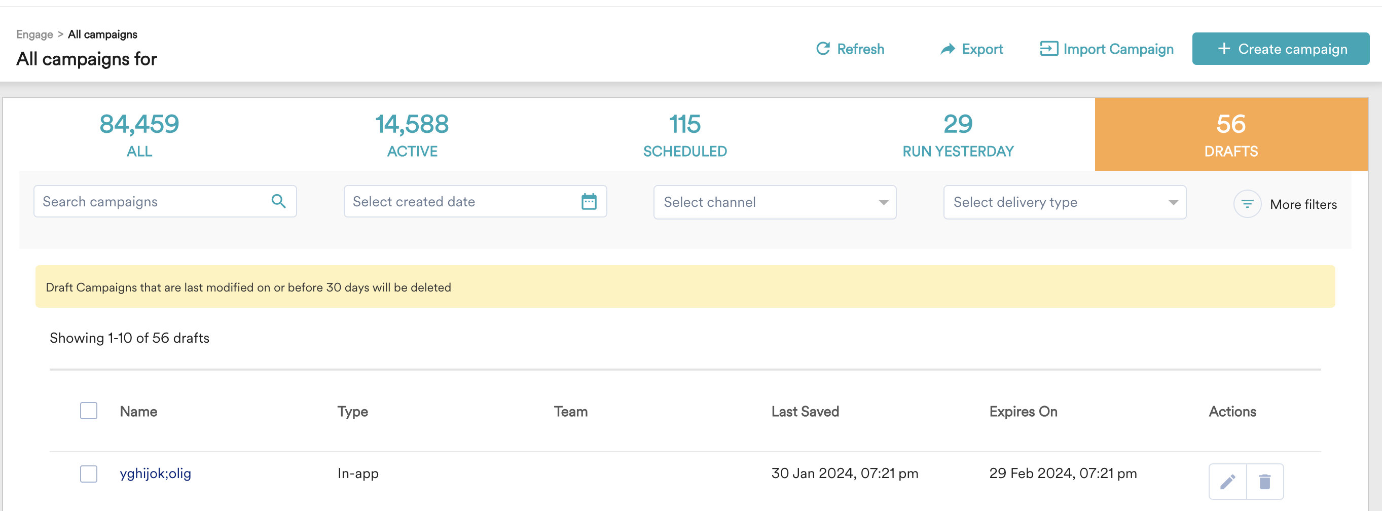 - 「 MoEngage ダッシュボード 」 > 「 エンゲージ 」 > 「 ドラフト 」。ドラフトには すべてのキャンペーン ページからもアクセスできます。